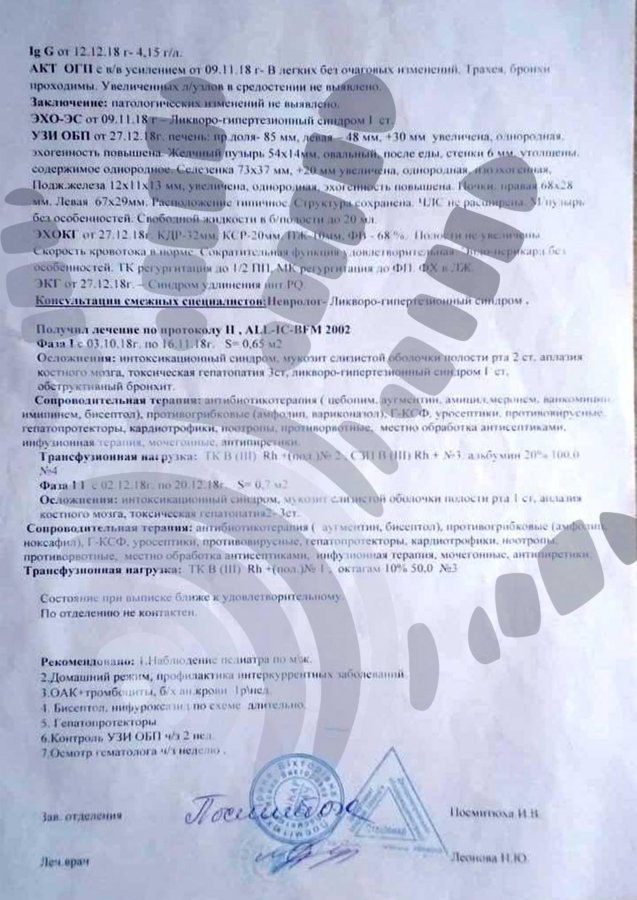 Перший етап хіміотерапії малюк переніс дуже стійко, незважаючи на те, що показники печінки сильновідрізнялися від норми. Після кожного курсу «хімії» проводили детоксикацію Реосорбілактом, підтримували печінку за допомогою Гептрала, стимулювали лейкоцити Нейпогеном і Зарсіо. Тоді завдяки вашій допомозі вдалося підтримати малюка необхідними препаратами.