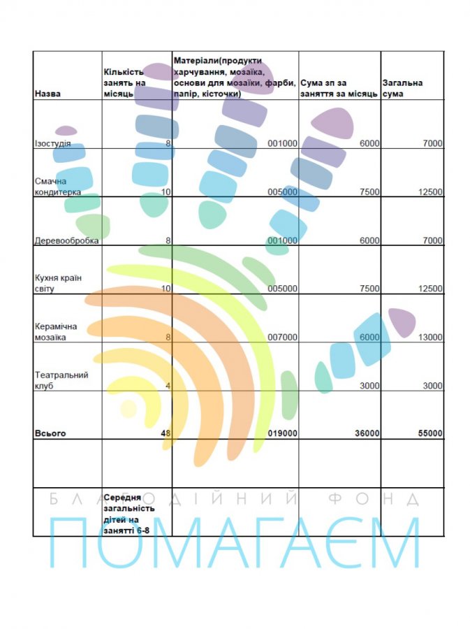 Всі заняття безкоштовні для дітей. Але для роботи потрібні фарби, папір, деревина, металева фурнітура, керамічна плитка, скляні камінці, продукти харчування тощо. І звісно, необхідно оплачувати працю керівникам студій. Наразі гуртки обходяться Центру в 55 000 грн на місяць. Для їх фінансування ми щомісяця шукаємо донорів.