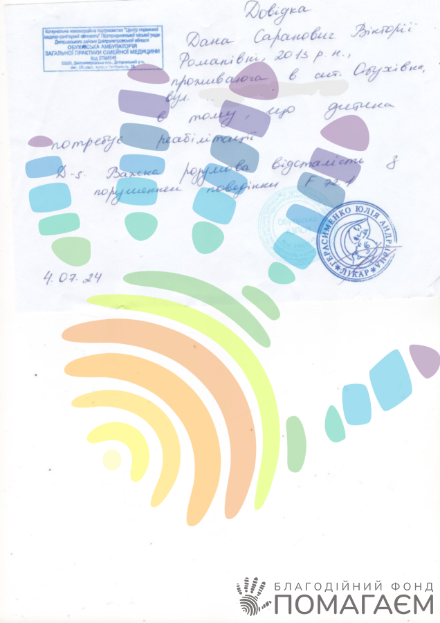 У Вікторії Саранович важка розумова відсталість – наслідок двостороннього крововиливу в мозок. Дівчинці потрібна регулярна реабілітація для максимального відновлення здоров'я. На вересень запланований черговий курс занять зі спеціалістами «Іоаннового центру», для оплати якого потрібно зібрати 15 000 грн.