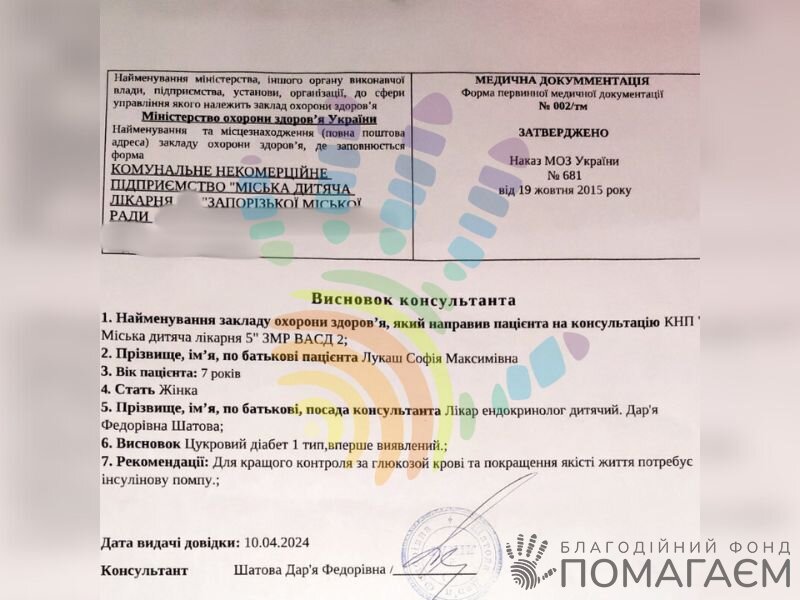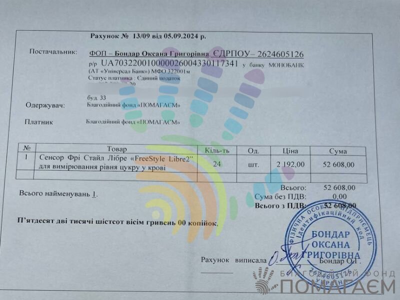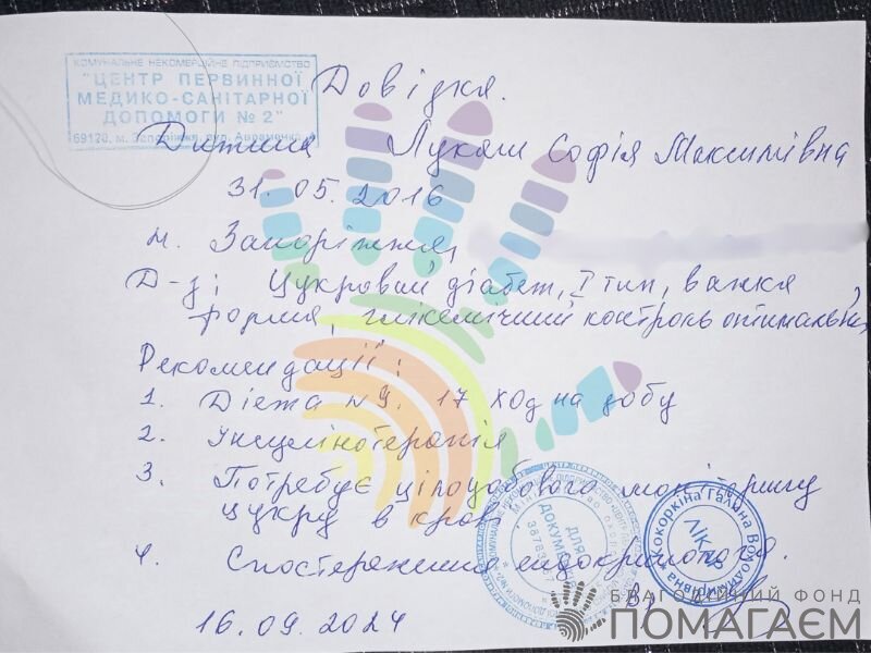 Ми відкриваємо збір на суму 52 608 грн. Цих коштів вистачить на придбання 24 сенсорів Freestyle libre 2. Єдиний дохід сім'ї – аліменти та виплати інвалідності. Будь ласка, простягніть руку допомоги Сонечці та її мамі!