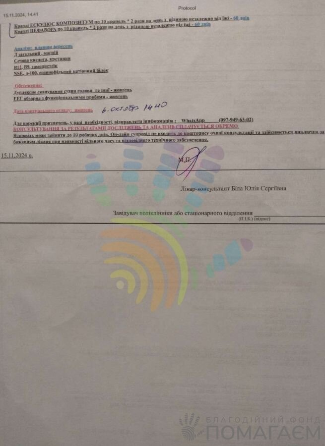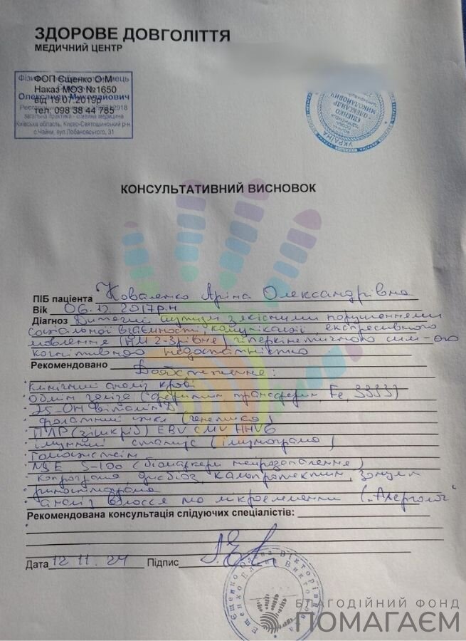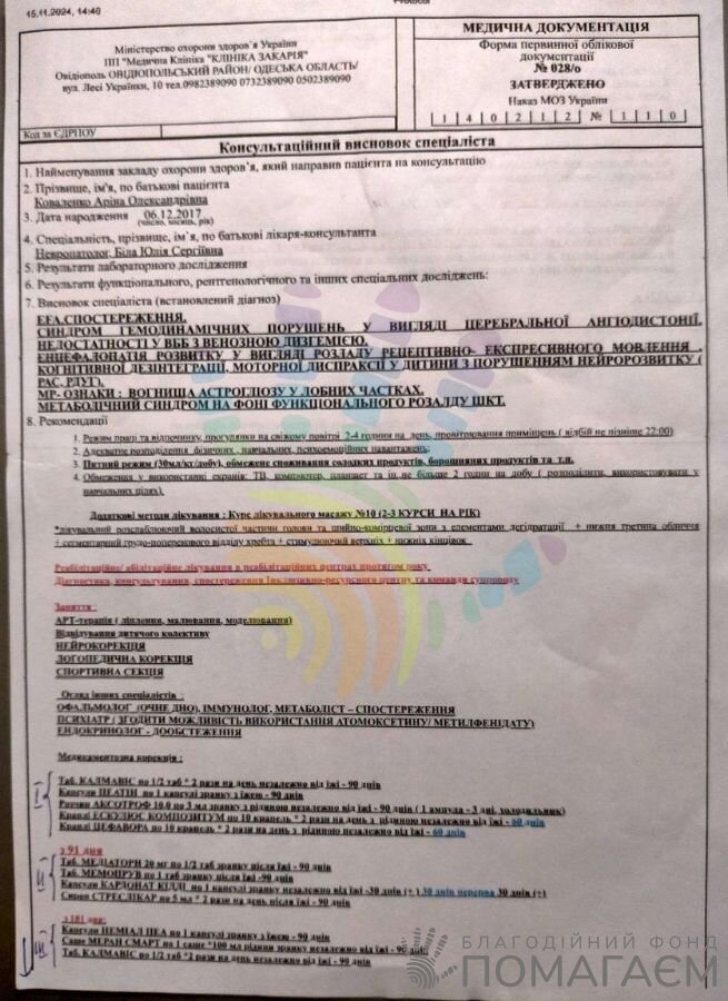 У листопаді дівчинка була на консультації невролога. Лікар прописав їй Ескулюс Композитум, Мемопрув, Цефавору, Аксотроф та інші препарати та розписав схему лікування на 9 місяців. Всіх препарати обійдуться сім'ї у 21 300 грн.