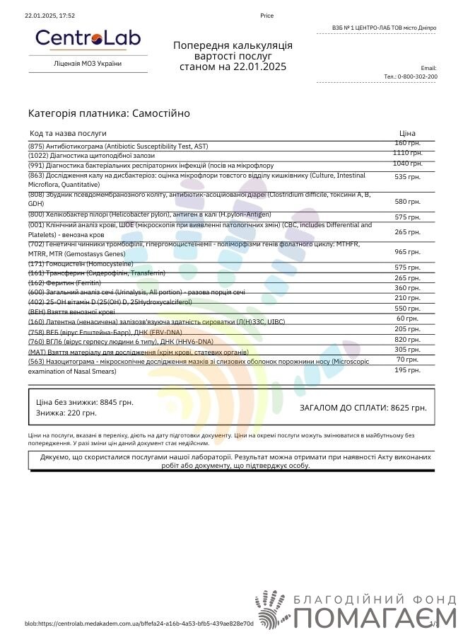 Генетик рекомендував Аріні пройти лабораторне обстеження, щоб зрозуміти причину схильності до утворення тромбів, порушень у роботі щитовидної залози, виключити наявність хвороботворних мікробів на слизових. Його вартість 8 625 грн.