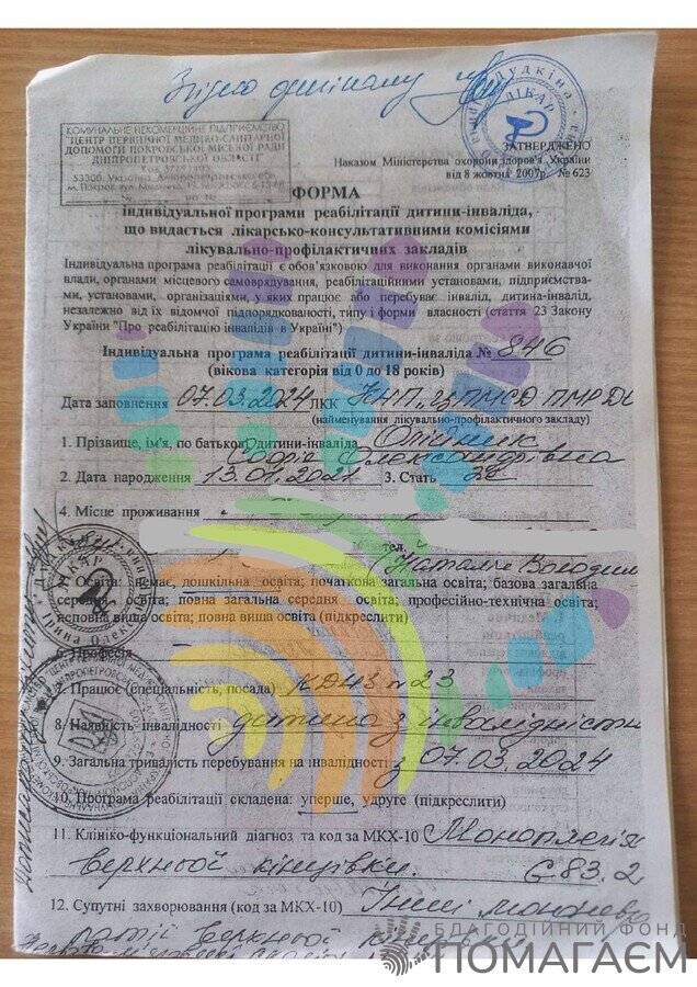 Софійка народилася з вагою 4 700 г. Під час народження вона отримала травму: її ліва рука погано рухається і коротша за праву, а кисневе голодування викликало проблеми з мовленням. Крім того, у дівчинки деформація хребта, колін та стоп. Софії дуже потрібні регулярні заняття, на березень запланований курс реабілітації в «Іоанновому центрі» вартістю 15 000 грн.