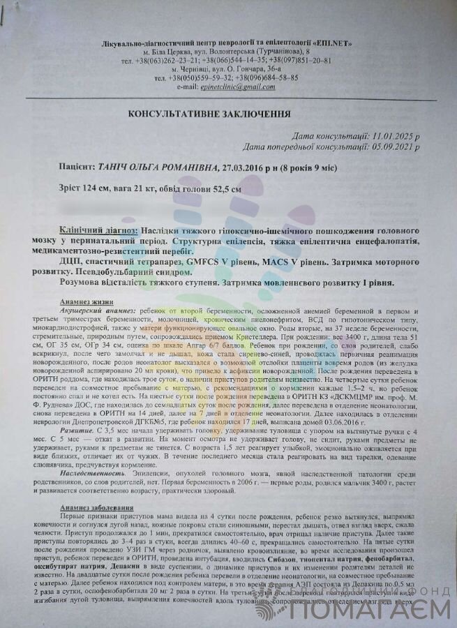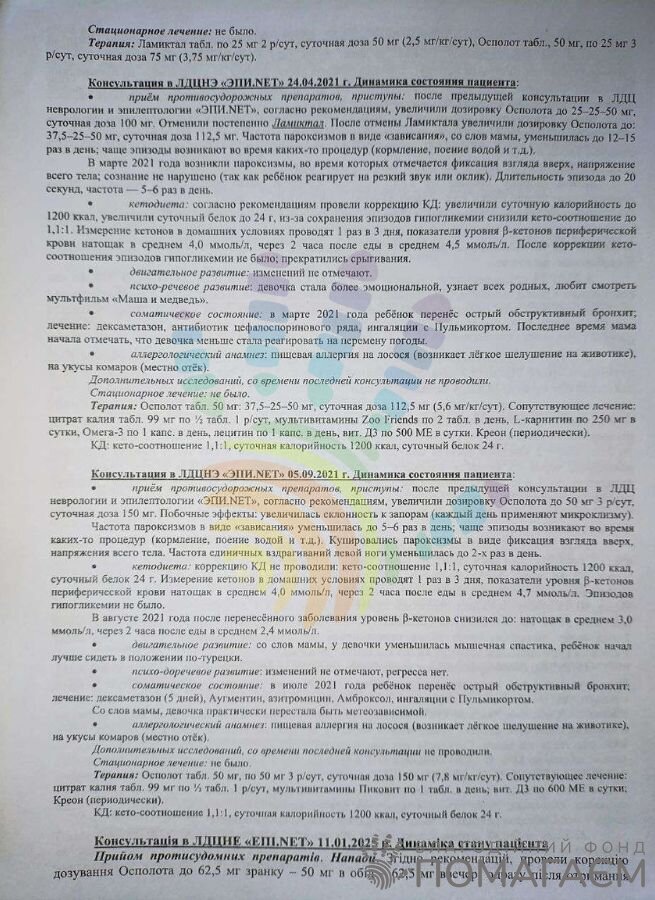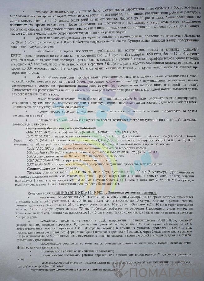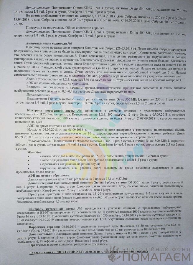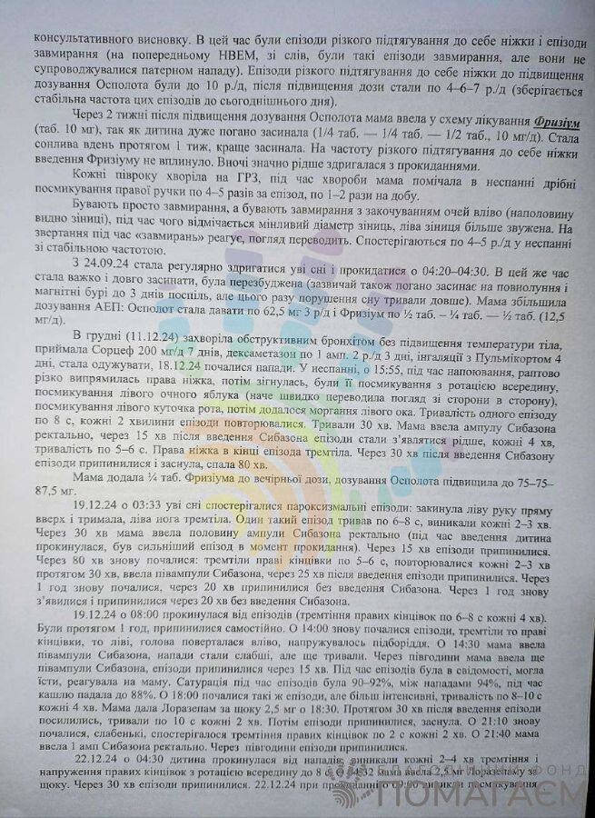 Більше трьох років Олечка жила без судом. Але у грудні 2024 року після перенесеного бронхіту напади поновилися. У січні дитину обстежили в «Епі.Нет», після чого був призначений новий протисудомний препарат Сабрил, на додачу до Осполоту та Фрізіуму.