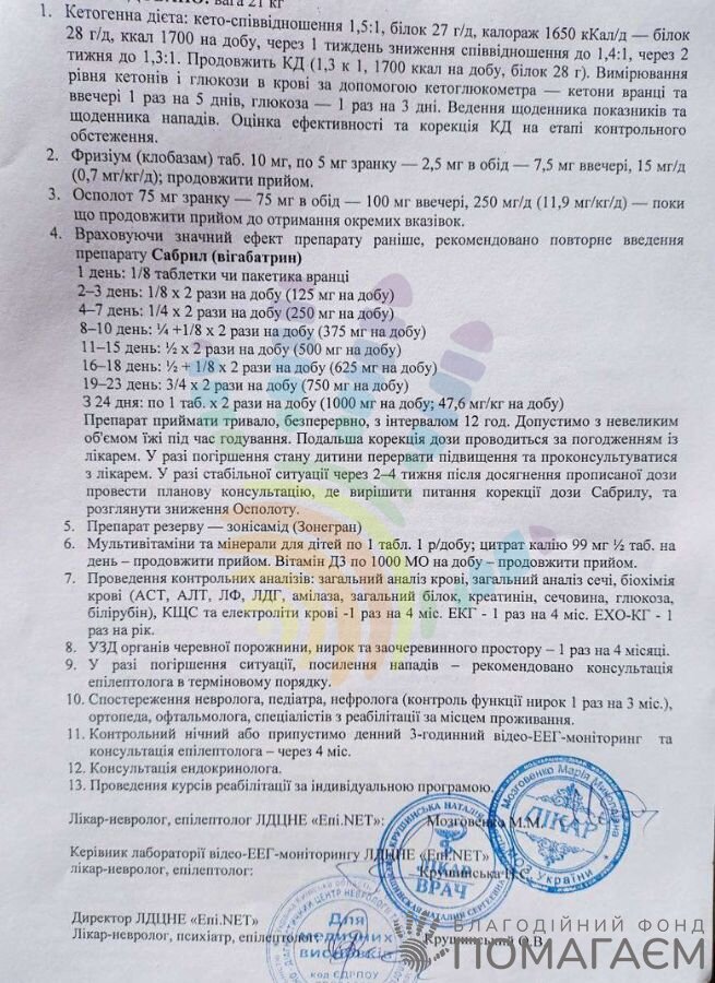 З двомісячного віку Олю лікує епілептолог Олег Крушинський у лікувально-діагностичному центрі «Епі.Нет». У неї важка форма епілепсії, тому крім протисудомних препаратів довелося застосувати гормонотерапію і кетогенну дієту. Гормональний препарат спричинив підвищення тиску до 220/140, його скасували. А ось кето-дієта працює досі.