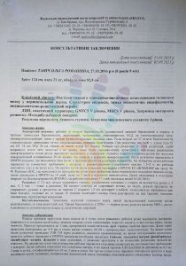 Дівчинка не розмовляє, але частково розуміє звернене мовлення. Вона вміє перевертатися з боку на спину, сидіти з підтримкою та недовго утримувати голову.