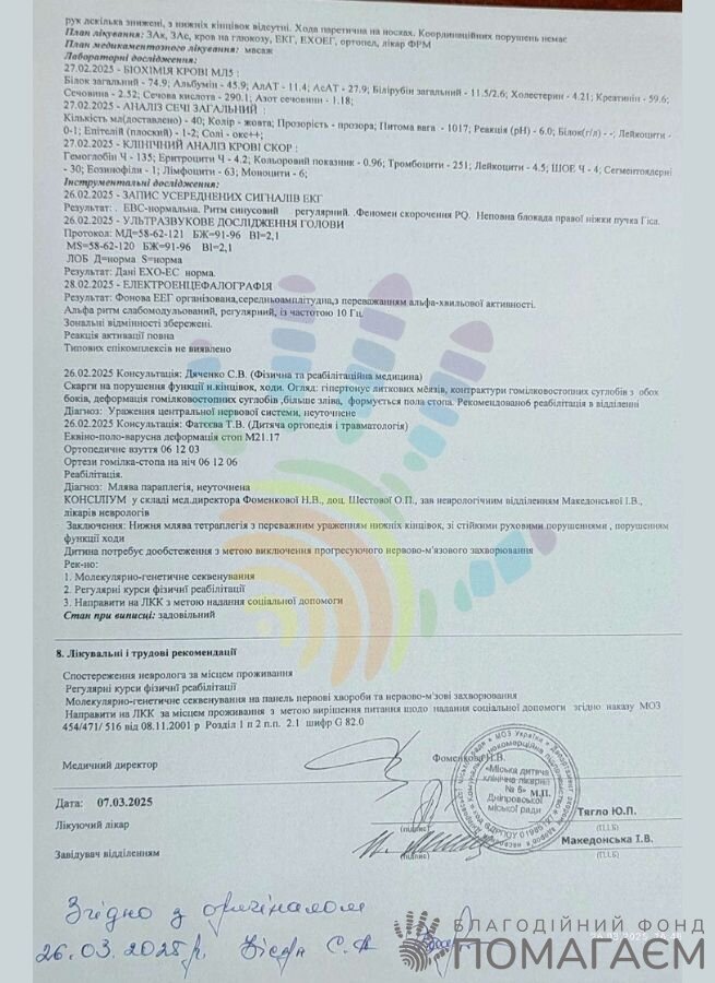 Дитині призначили молекулярно-генетичне секвенування; родина планує його провести у спеціалізованому центрі «Мама Папа». Якщо діагноз підтвердиться, лікарі зможуть призначити правильне лікування та зупинити розвиток хвороби.