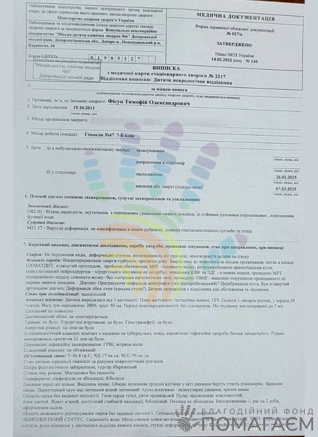 Наразі він носить ортези та ортопедичне взуття, а також регулярно проходить курси реабілітації. Незабаром у Тимофія буде важлива консультація у ортопеда, де лікар ухвалить рішення щодо термінів операції: зараз або чекати завершення пубертату.