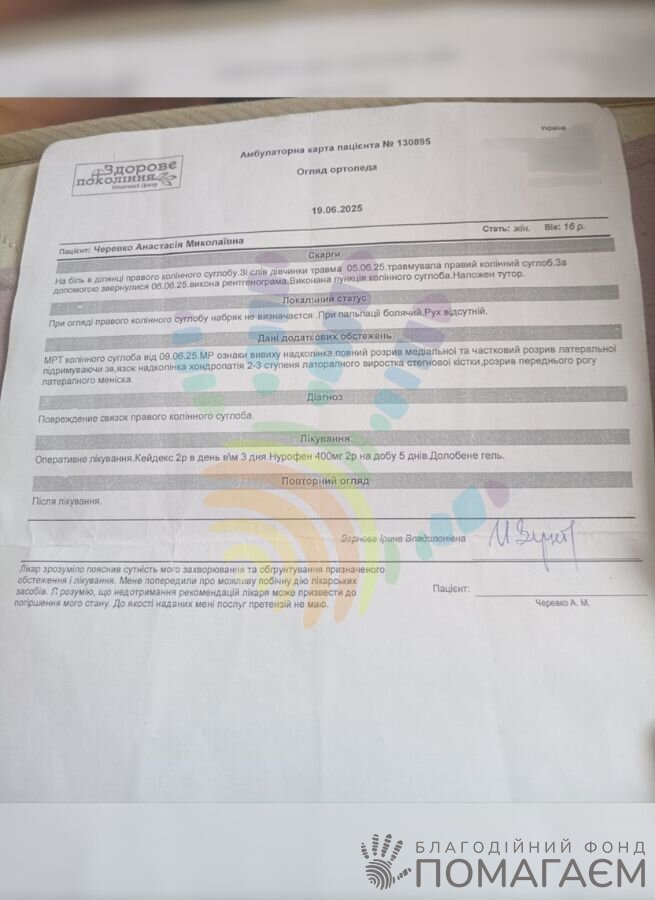 Наталя терміново повезла доньку до Дніпропетровської обласної дитячої лікарні. Там Насті зробили рентген, пункцію, наклали пов'язку. Через 3 дні зробили МРТ. Діагноз виявився страшнішим, ніж очікувалося: вивих надколінка, розрив зв'язок і меніска.