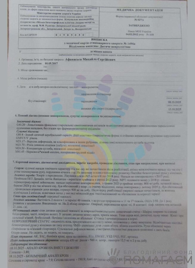 Михайлику зі Слобожанського лише 8 років. Незважаючи на спастичну квадриплегію (важку форму ДЦП) та невтішні прогнози лікарів, він щодня опановує те, що раніше здавалося недосяжним. Щоб хлопчик зміг продовжити свій розвиток, йому необхідно пройти черговий курс реабілітації в «Іоанновому центрі». Для цього потрібно зібрати 23 000 грн.