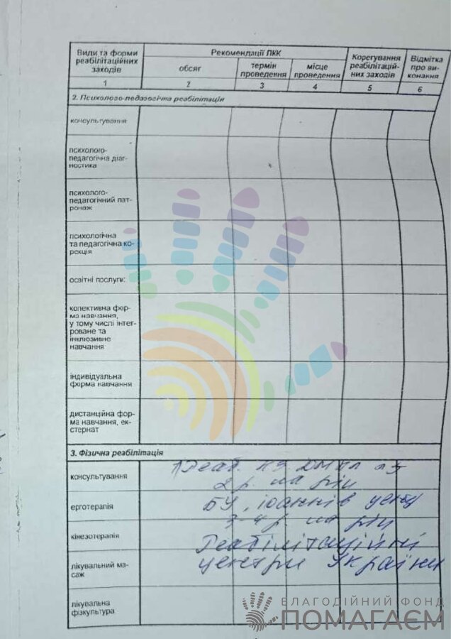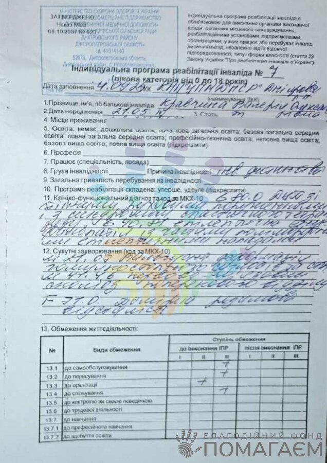 У Валерії ДЦП, помірна розумова відсталість, викривлення хребта та проблеми з мовленням. Їй потрібна регулярна реабілітація.