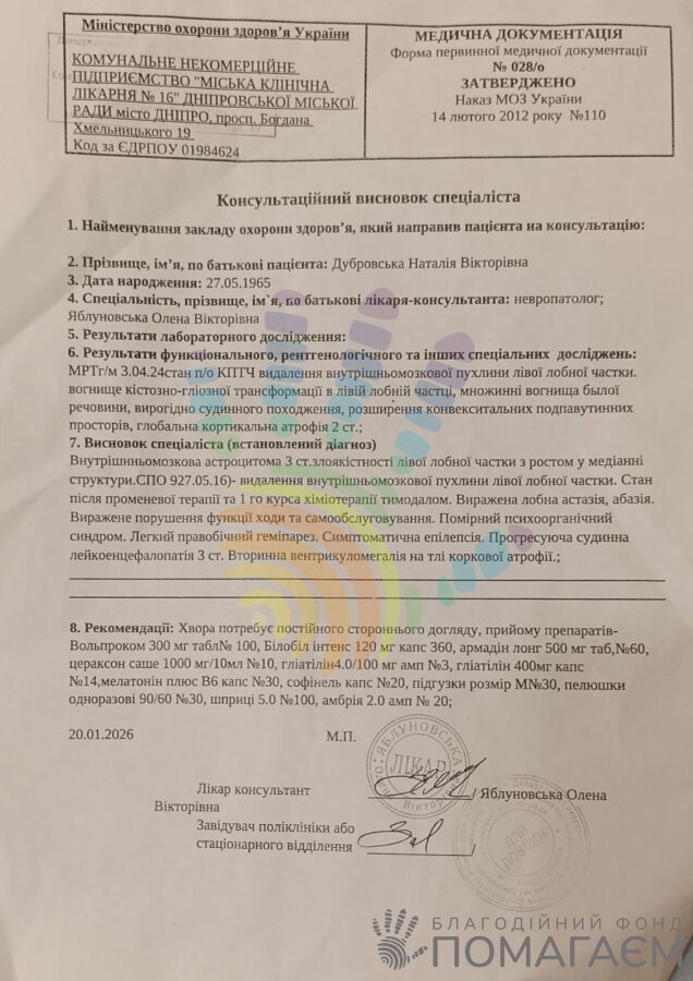 Необхідно зібрати 16 856 грн, щоб на 3 місяці забезпечити Наталію шприцами для ін'єкцій та життєво важливими препаратами: для контролю судом (Вальпроком), покращення мозкового кровообігу й пам’яті (Цераксон, Амбрія, Армадин Лонг, Гліатилін), сну (Мелатонін В6) тощо.