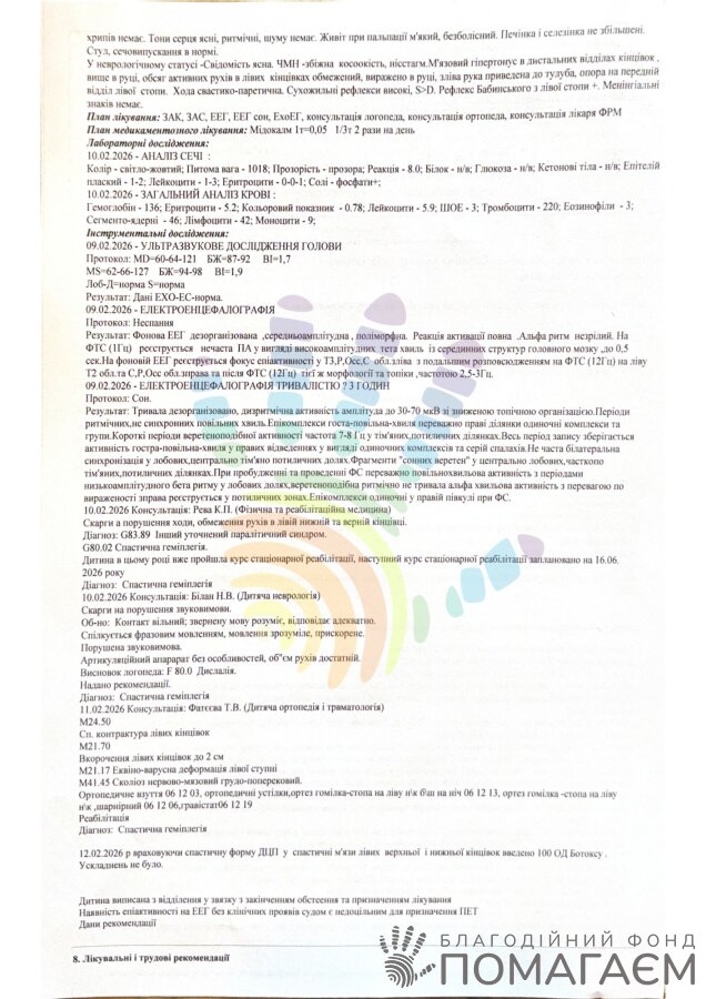 У березні Еммануїла чекають фахівці «Іоаннового центру», щоб працювати над зниженням спастичності, покращенням рухливості суглобів. Це дозволить попередити подальше укорочення ноги.