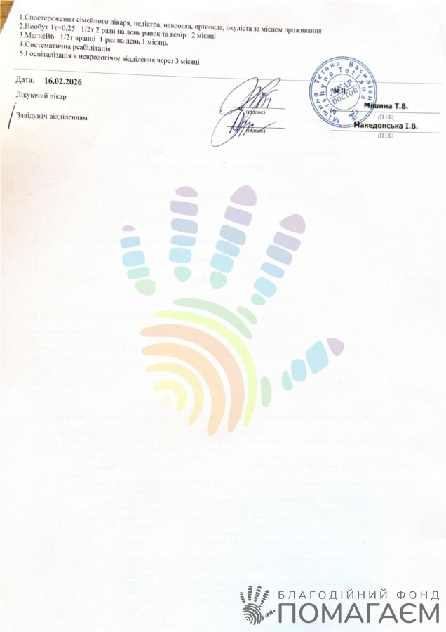 Кожні 2-3 місяці хлопчик проходить реабілітацію в «Іоанновому центрі», центрі «БудеТак» та в неврологічному відділенні Дніпра. Заняття допомагають зменшити спастику, відновити рухливість тіла й не допустити погіршення стану.