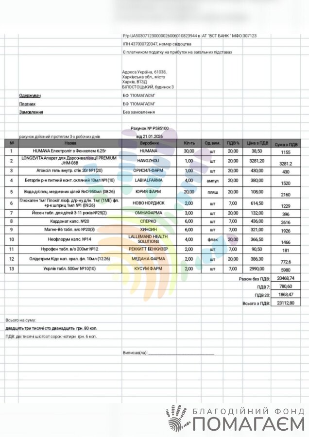 При погіршенні самопочуття йому потрібні Humana Elektrolyt, Атоксил гель, Бетаргін, вода ReO, для невідкладної допомоги – Глюкаген, а для підтримки роботи внутрішніх органів Йосен, Кардонат, Магне-В6, Неофлорум, Нурофен, Олідетрим Кідс та Укрлів, загальною вартістю 19 832 грн.