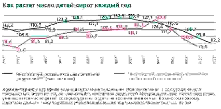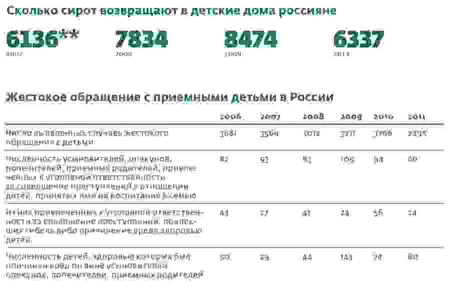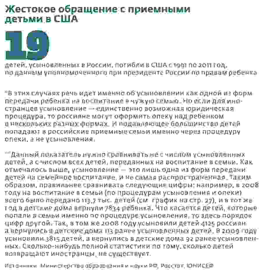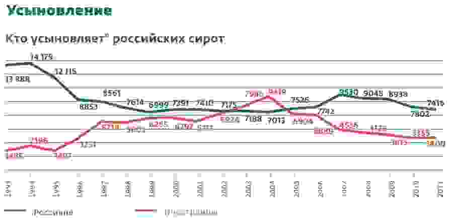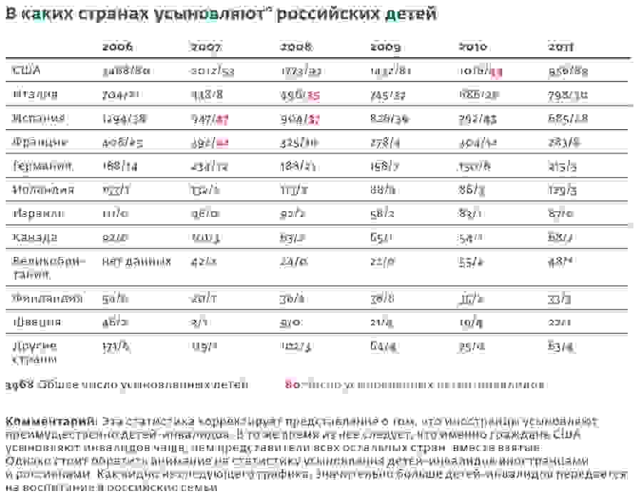 — То, что инвалидов и детей старше семи лет берут одни американцы, — это миф. Они так же, как и все, хотят здоровых детей не старше трех лет. Посмотрите, в 2011 году граждане США усыновили 956 детей, из них 89 инвалидов. А российские граждане за тот же период взяли на усыновление и под опеку около 1700 одних инвалидов. Так что у нас вполне есть шанс справиться с проблемой самостоятельно: из 126 тысяч сирот, которые сейчас содержатся в спецучреждениях, процентов тридцать могут быть легко возвращены в родственные семьи, а остальным можно найти приемных родителей. Если этим прямо сейчас начать заниматься, можно решить задачу в течение 3–5 лет.