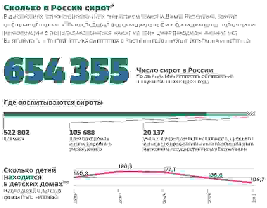 — Не надо пороть истерику и нагнетать неправдоподобный пафос, — просит Жаров. — Есть факты, с ними и надо работать. Детей, лишенных попечения родителей, в России 678 тысяч. Из них 550 тысяч живут в приемных семьях. Остальные 120 тысяч — в детских домах. Примерно 50 тысяч — тяжелые инвалиды. Таких детей трудно устроить в семьи в любой стране: и в Америке, и в России. То есть, когда мы говорим о сиротах, которые живут в казенных учреждениях исключительно по вине государства, речь идет о 70 тысячах детей. Никакой программы по поиску приемных семей или хотя бы приоритета семьи перед госучреждением в России на практике, увы, нет.
