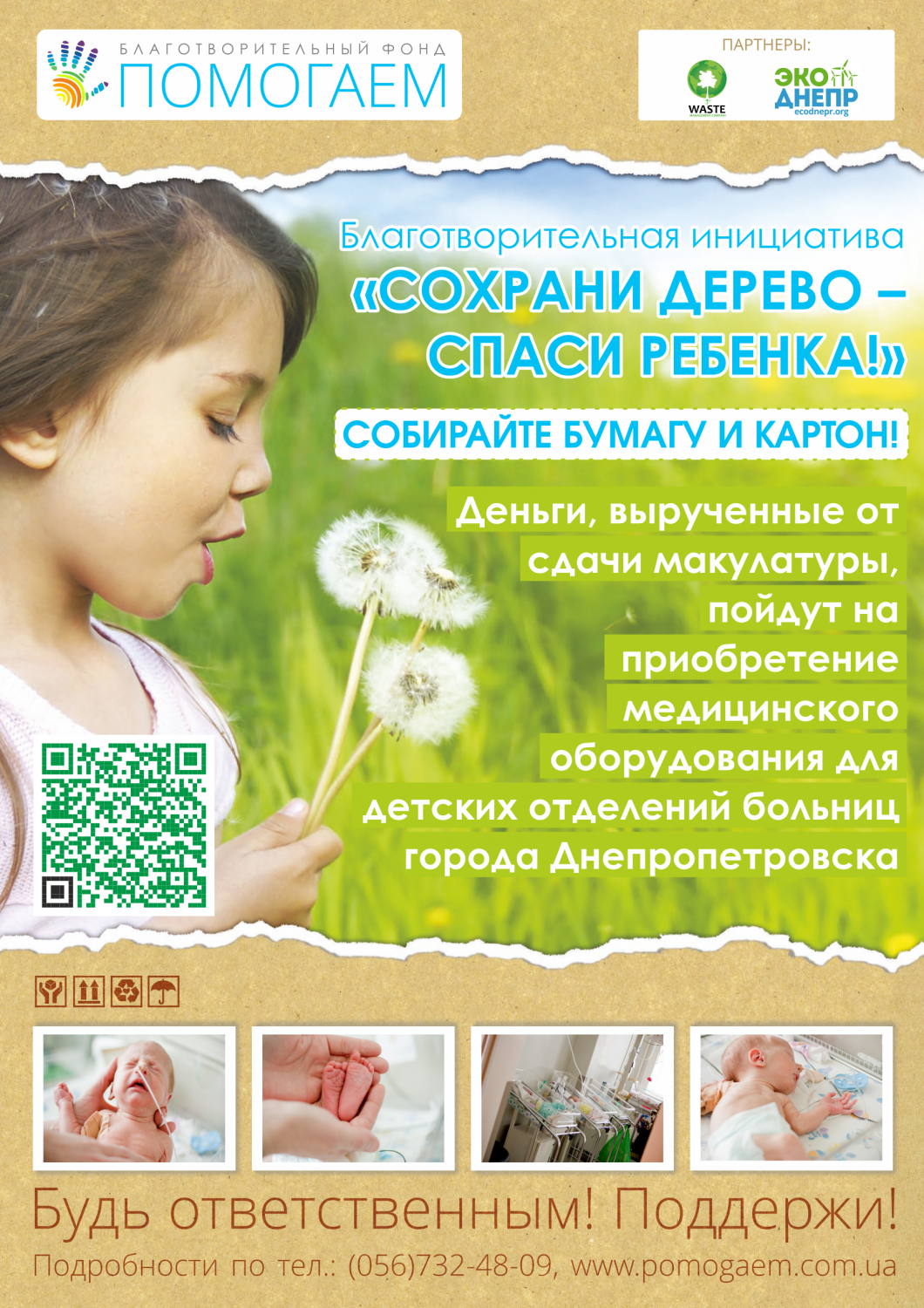 Стоимость установки 14 950 грн. Чтобы собрать всю необходимую сумму, одной макулатурой вряд ли удастся обойтись, поэтому сбор пожертвований для покупки ультразвуковой мойки уже открыт на сайте Благотворительного Фонда «Помогаем». Очевидно, что в нынешнее непростое для Украины время рассчитывать на бюджетное финансирование покупки медицинского оборудования не приходится. Но участвуя в благотворительной инициативе «Сохрани дерево – спаси ребенка» каждый житель города может совместить приятное с полезным – избавиться от ненужной бумажной продукции, помочь экологии ипомочь детям. А купленное оборудование будет служить на пользу юным жителям города Днепропетровска, которым необходима медицинская помощь.