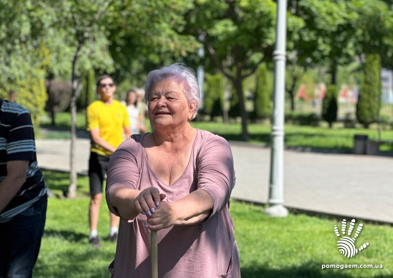 Учасниця занять пані Валентина трохи розповіла нам про себе: «Я з міста Бахмут. Квартира наша там «знешкоджена» прямим попаданням. Переїхали сюди 7 квітня 2022. Знімаємо квартиру разом із дочкою, зятем та двома онуками. Займаюся фізкультурою тут із самого початку. Подобається все: наш супровід, керівниці, і як ми біля них заряджаємося позитивом. Дуже вам дякуємо! Бачите, скільки радості від занять!»