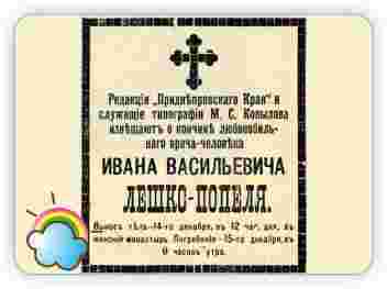 Другую девушку мать повезла в Харьков к профессорам. Те нашли чахотку в последней степени. Сообщили матери, но больную расстраивать не стали: прописали лечение и отправили домой в Екатеринослав. Девушка заявила, что другого доктора, кроме как Лешко-Попеля, и видеть не хочет. Доктор жил на другом конце города и денег на извозчиков в семье не было… Мать пошла к Ивану Васильевичу и попросила прийти разок, чтобы ободрить больную. Доктор пришёл. Девушка обрадовалась, как ребёнок: «Вот мне уже легче». С тех пор Иван Васильевич заходил каждый день до самой смерти девушки, не взяв за это ни гроша. Та, задыхаясь от кашля, говорила: «Не беспокойся, мама, это пустяки. Разве ходил бы доктор каждый день, если б надежды не было?» «Зачем вы тратите на нас напрасно столько времени?» - переживала мать, провожая Ивана Васильевича. «Не напрасно, если можно дать больной хоть сколько-нибудь радости», - был ответ.