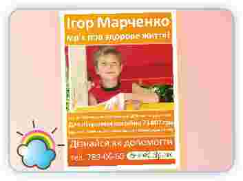 17-18 березня пройшли перші акції на підтримку тяжкохворих дітей із циклу «Добрі серця Дніпропетровська». Було зібрано 1 905 грн 64 коп. Усі кошти підуть на лікування дев’ятирічного Ігоря Марченка.